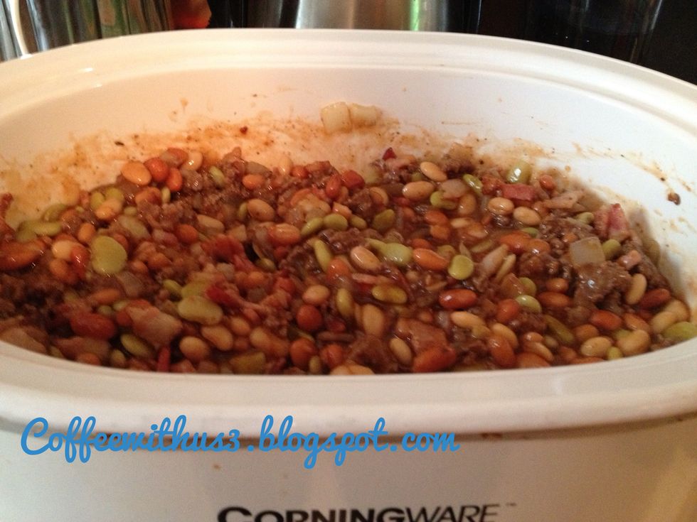 Brown ground beef with onions. Drain all cans except pork & beans. Add the cans to the slow cooker. Add bacon, brown sugar, bbq sauce, ketchup, vinegar, garlic salt, salt, & pepper. When beef is browned add that to the slow cooker. Cover and heat on high until mixture is hot. If you want to start it in the morning, turn on low and cook for 6-8 hours.