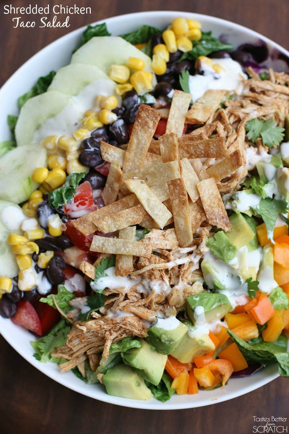 Delicious slow cooker shredded chicken layered on a delicious taco salad packed with fresh veggies and drizzled with a Chipotle Ranch Crema.