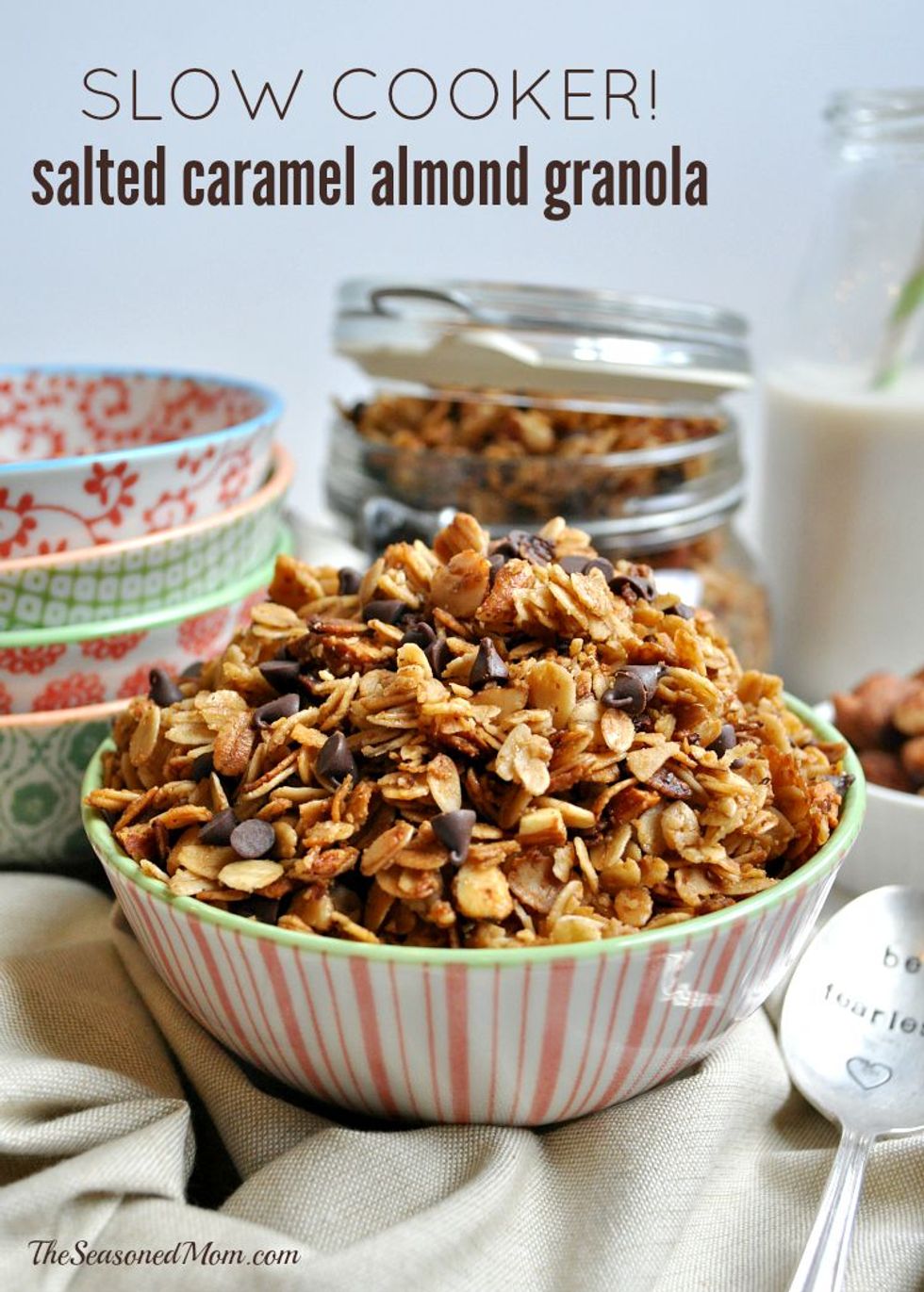The sweet-and-salty flavor combination in this Slow Cooker Salted Caramel Almond Granola will leave you craving the crunchy treat for breakfast, snack, and dessert! It can be made vegan, dairy-free, and gluten-free…and best of all it bakes slowly in your Crock Pot while you go about your busy life. This granola is the perfect make-ahead breakfast or snack option for Back-to-School season (or for any other time of year)!