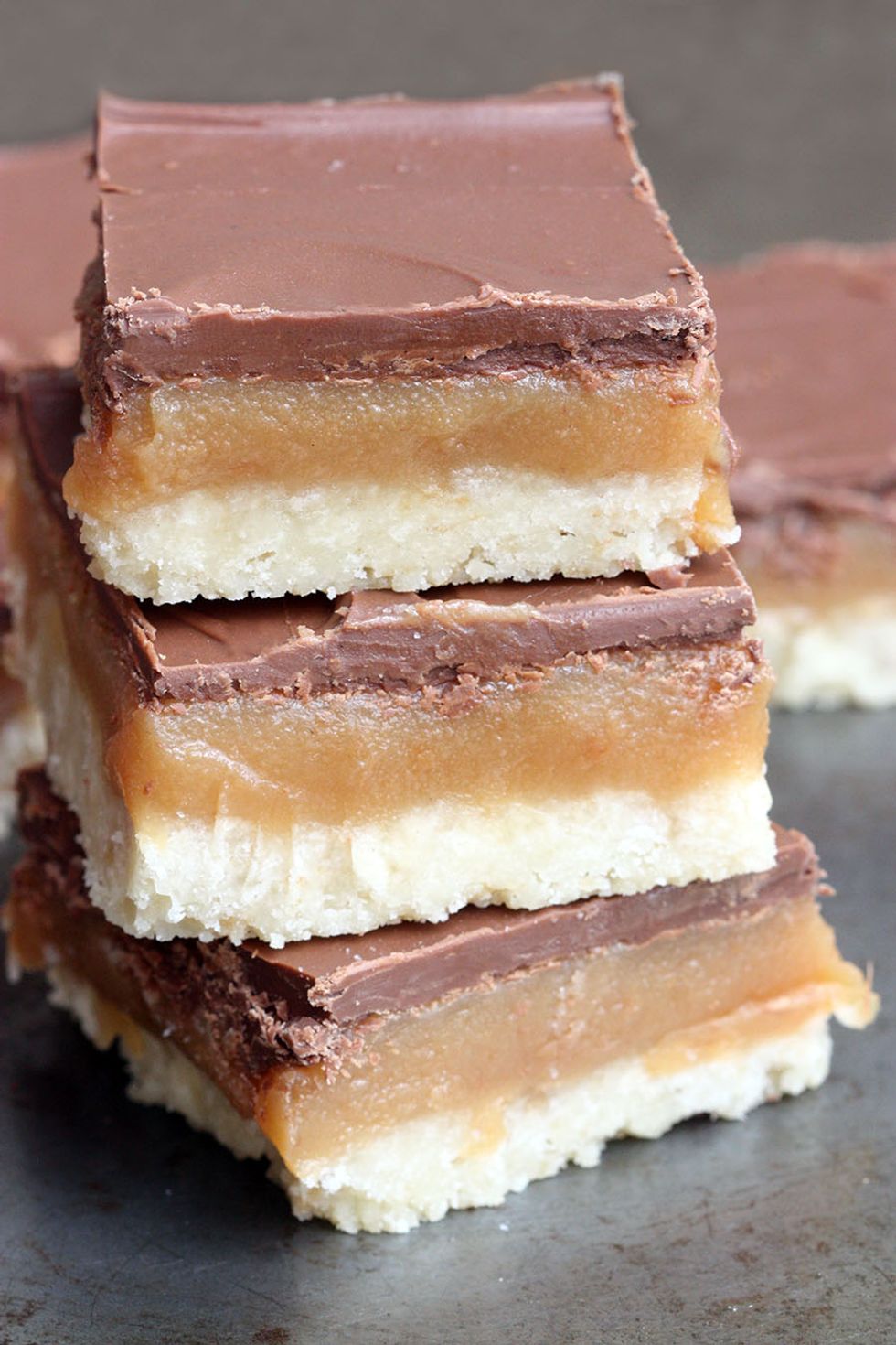 The most amazing Homemade Twix Bars with an easy shortbread crust, a layer of homemade caramel, and melted chocolate on top.