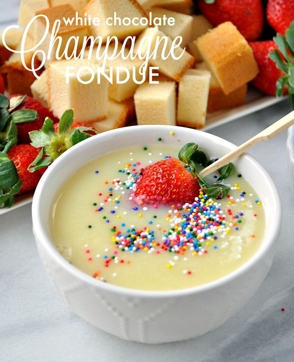 You only need 4 ingredients and about 15 minutes for this Champagne White Chocolate Fondue recipe! The easy dessert is perfect for a holiday party, a New Year's Eve gathering, or a romantic Valentine's Day date. Make it on the stovetop or in the Crock Pot!