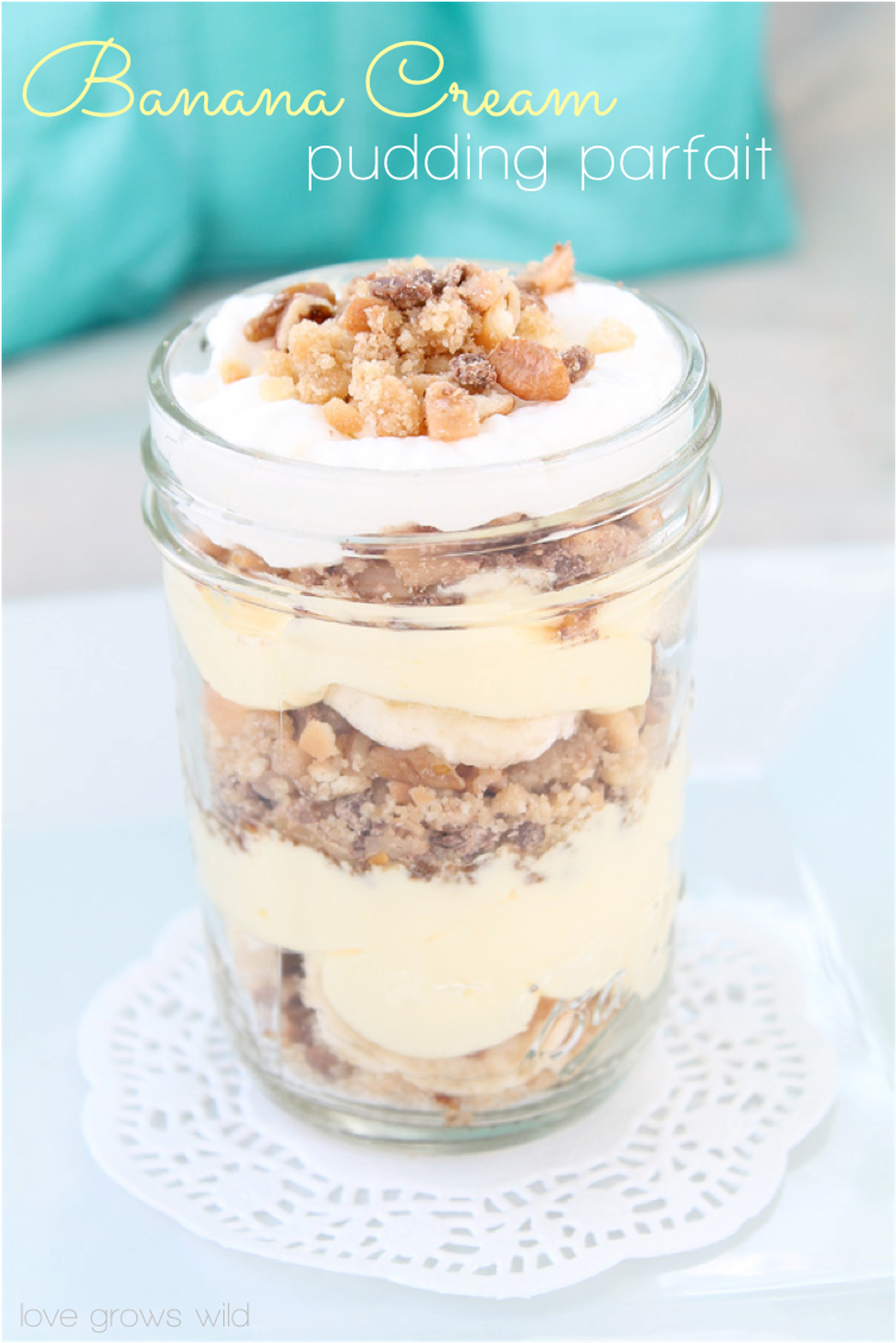 There are some desserts that are good, and then there are some desserts that are AMAZING! This one definitely falls into the amazing category! These Banana Cream Pudding Parfaits have nine delicious layers of creamy, crunchy banana flavor that will have you coming back for more! These parfaits are perfect for taking to picnics and parties too! Just make them in mason jars, and they are ready to serve. No plates needed!