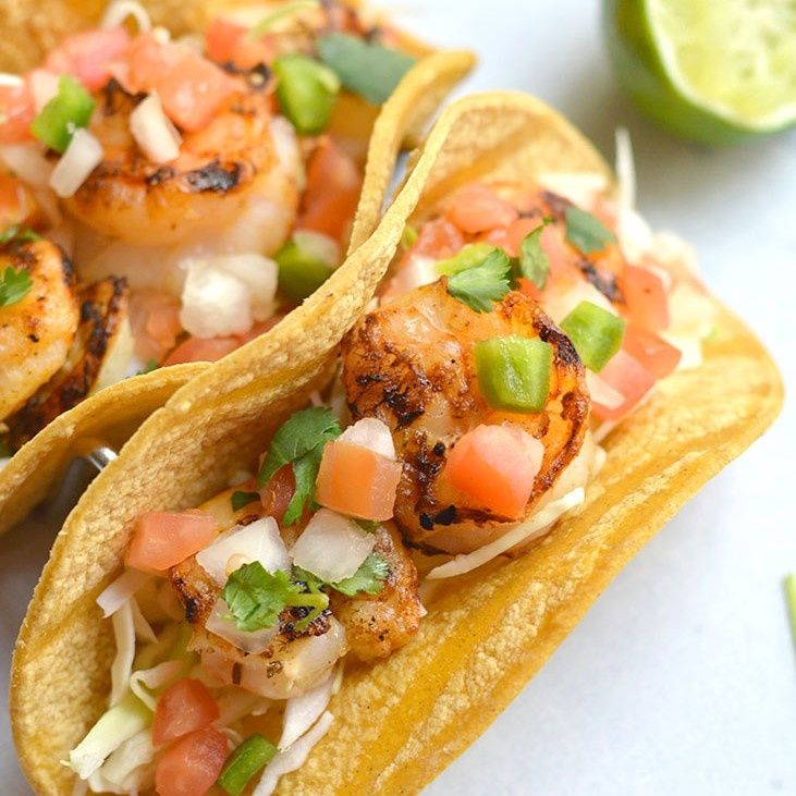 10 Minute Grilled Shrimp Tacos! This lightened up recipe shows you how to do tacos healthier and in a breeze. Grilling shrimp produces delicious flavor and can be easily done with a grill pan. A healthy dinner for busy weeknights or weekend BBQ's! Gluten Free + Low Calorie with a Paleo option