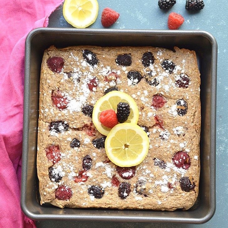 100 Calorie Berry Lemon Breakfast Bars! Super easy baked breakfast bars filled with sneaky healthy ingredients. Balanced in carbs, protein and healthy fat, these bars are a favorite breakfast meal prep recipe and only 100 calories! Gluten Free + Low Calorie
