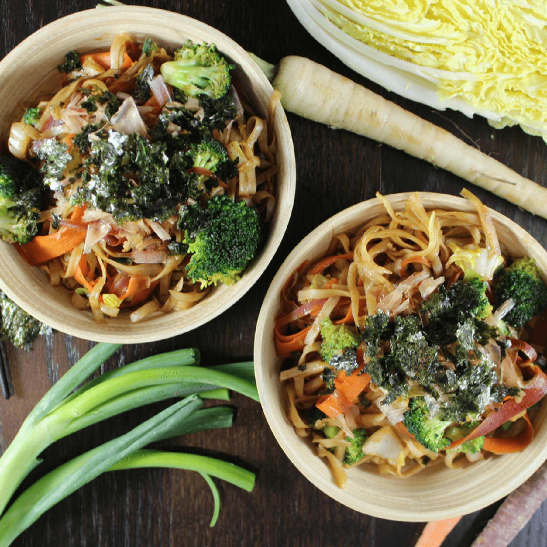 15 Minute Yakisoba with cabbage, broccoli, carrots, bonito and seaweed flakes garnish.