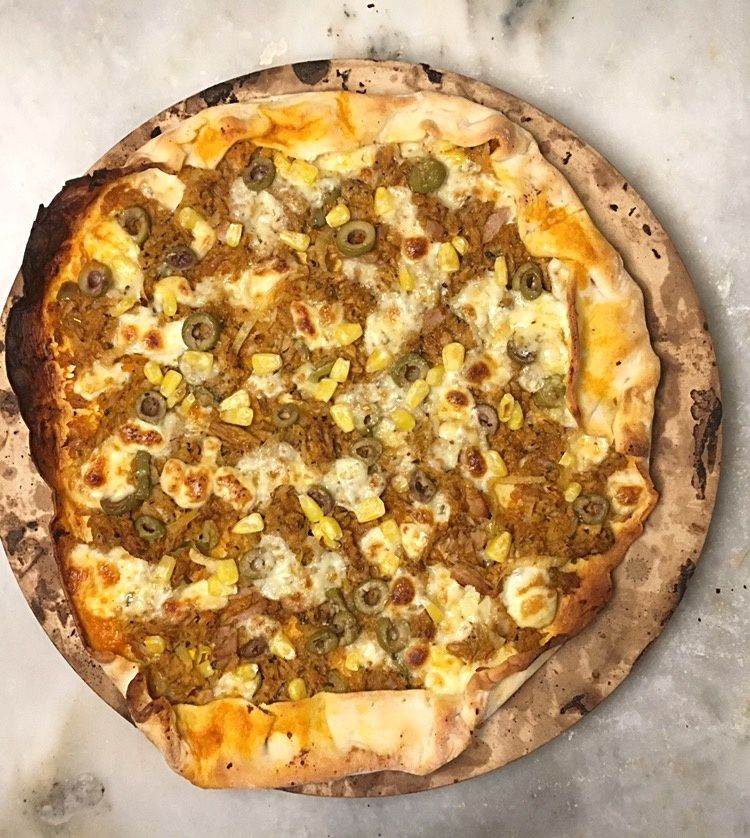 Perfect easy to make homemade dough topped with fresh sauce, sauteed onion and tuna, corn, green olives and a whole lot of cheese.