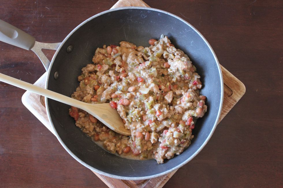 Add the ground turkey to the pan and stir into the oil so that the meat will coat evenly.