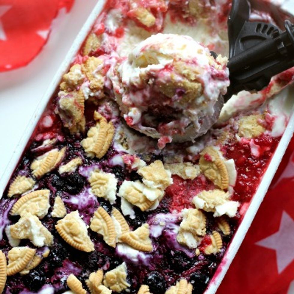 Delicious strawberries, raspberries and blueberries swirled into a creamy, decadent cheesecake ice cream, No ice cream maker necessary.