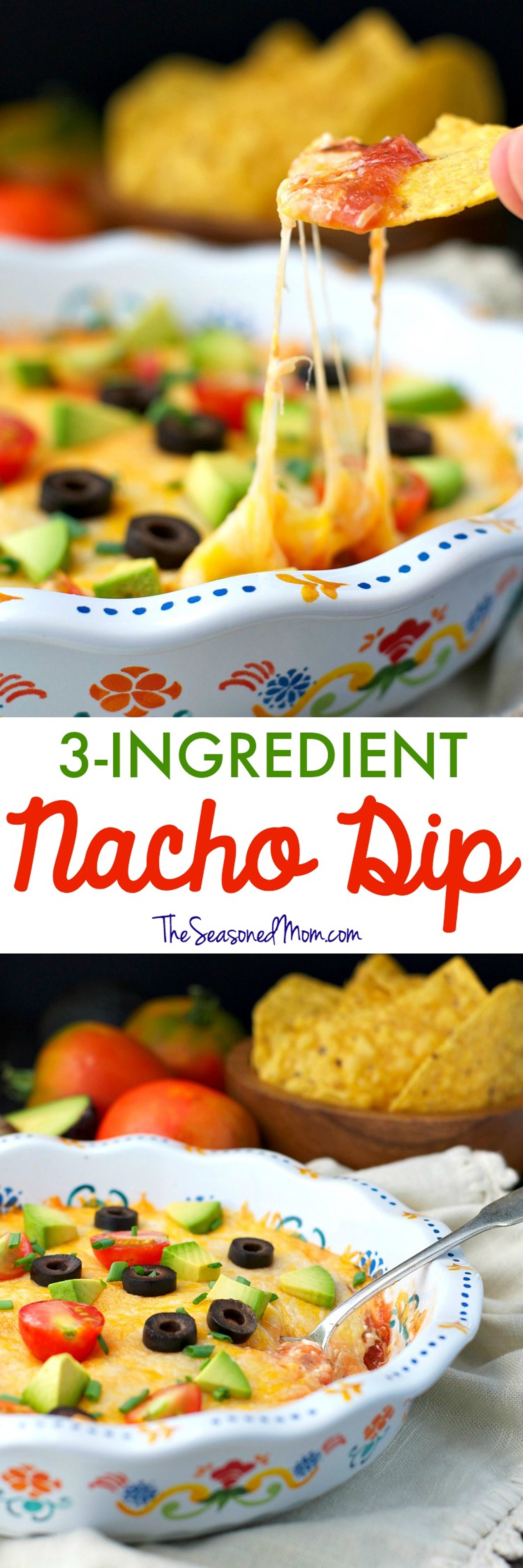 This 3-Ingredient Nacho Dip is a quick and easy appetizer for all of your celebratory occasions! Whether you’re hosting a football tailgate, a family birthday, or just a night in with friends…spend less time in the kitchen with this simple cheesy party snack!