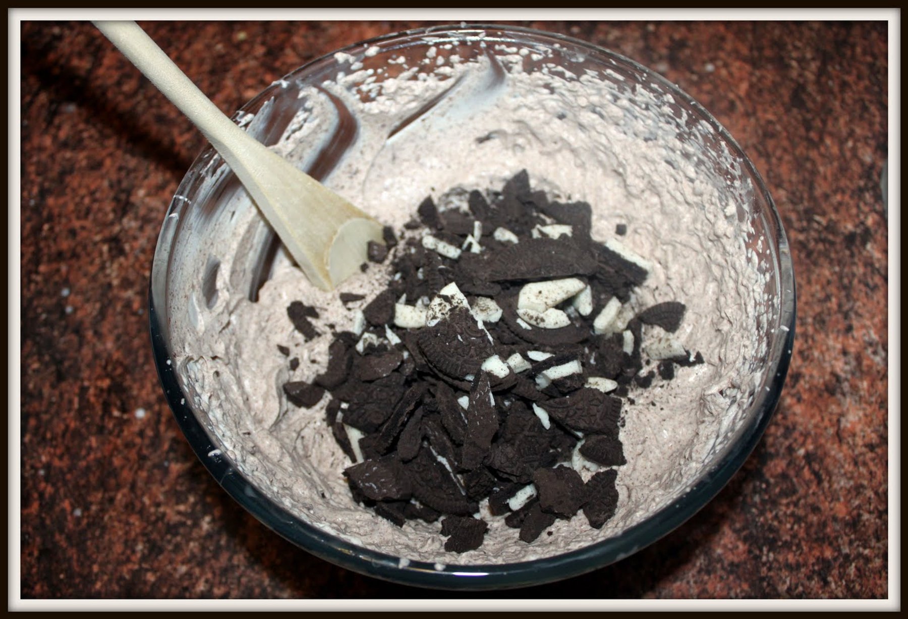 Add in preferred Oreo's. Place in an airtight container freezing for 6-8 hours before serving.