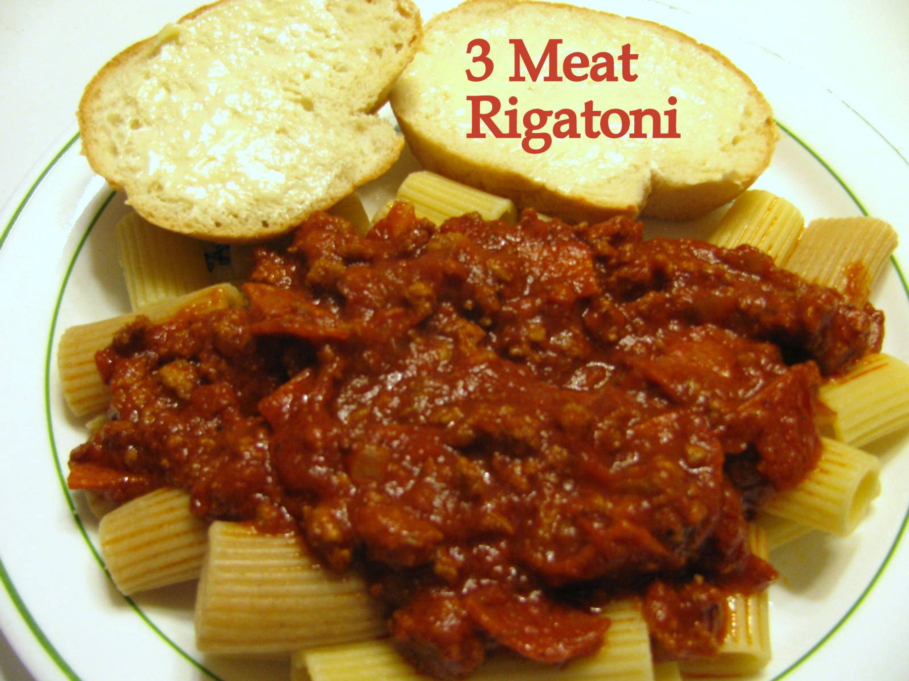 In large pot, brown beef and sausage; adding pepperoni when meat is nearly cooked. Drain off grease. Add remaining ingredients. Simmer for 2-4 hours. Cook rigatoni noodles according to package directions. Drain. Serve pasta with sauce and Parmesan cheese.