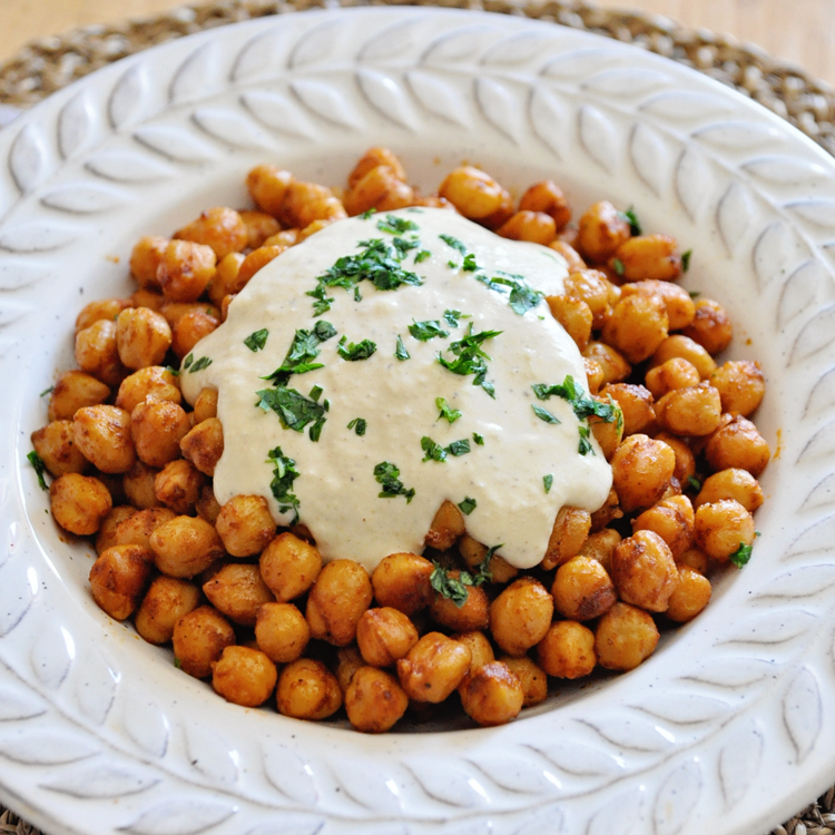 PAN ROASTED CHICKPEAS WITH CREAMY GARLIC SAUCE