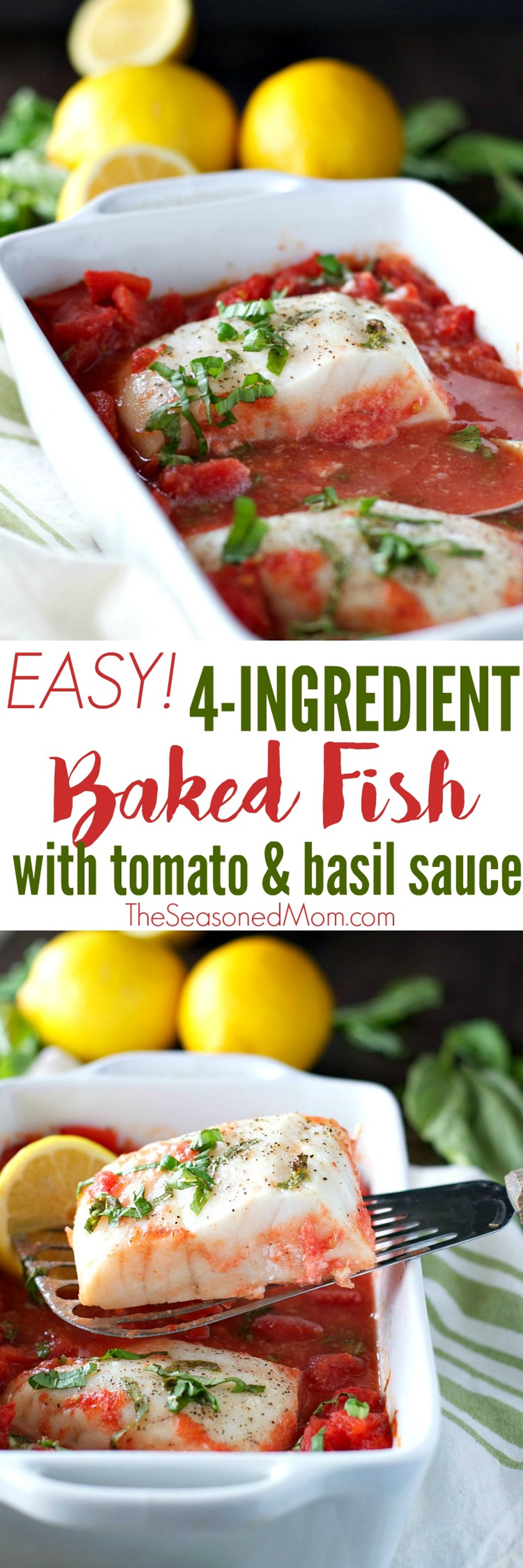 You only need 4 ingredients, one dish, and about 10 minutes to prepare a delicious seafood supper! This Baked Fish with Tomato and Basil Sauce is a healthy dinner that’s full of nutritious, clean eating ingredients for an easy and low calorie weeknight meal!