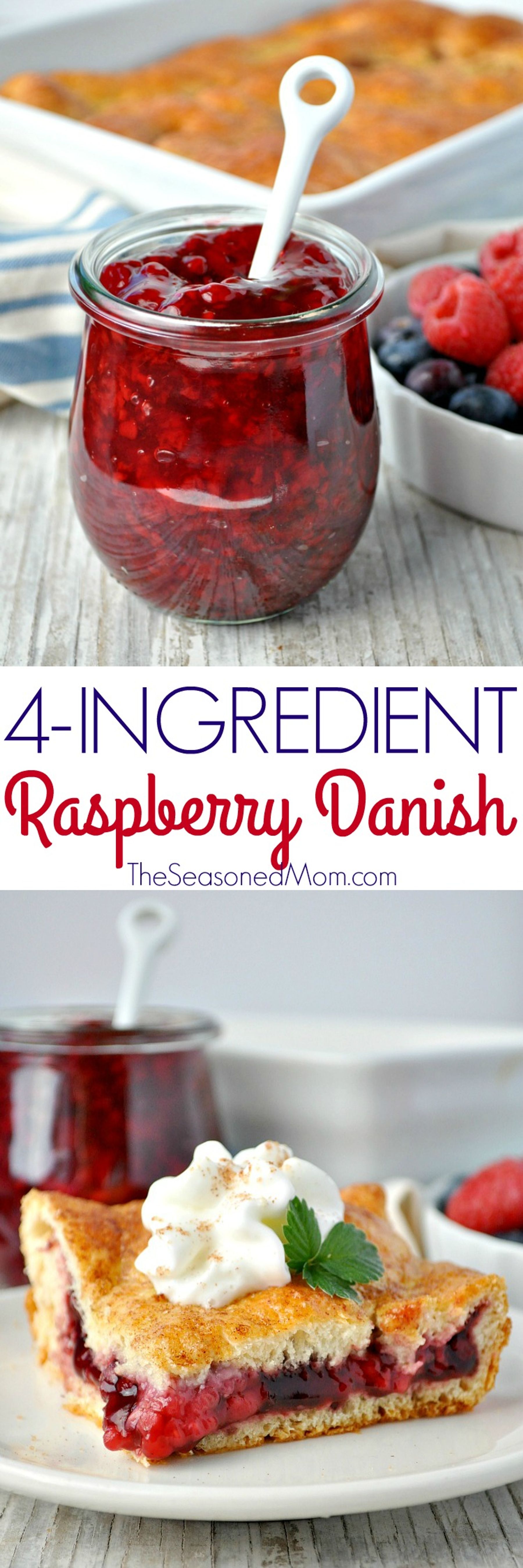 With just 4 simple ingredients and about 10 minutes you can pull together a delicious and comforting Raspberry Danish! Perfect for a weekend breakfast, a holiday brunch, or a quick dessert with ice cream, no one will ever guess the shortcuts behind this tender flaky pastry that’s bursting with fresh raspberry filling!