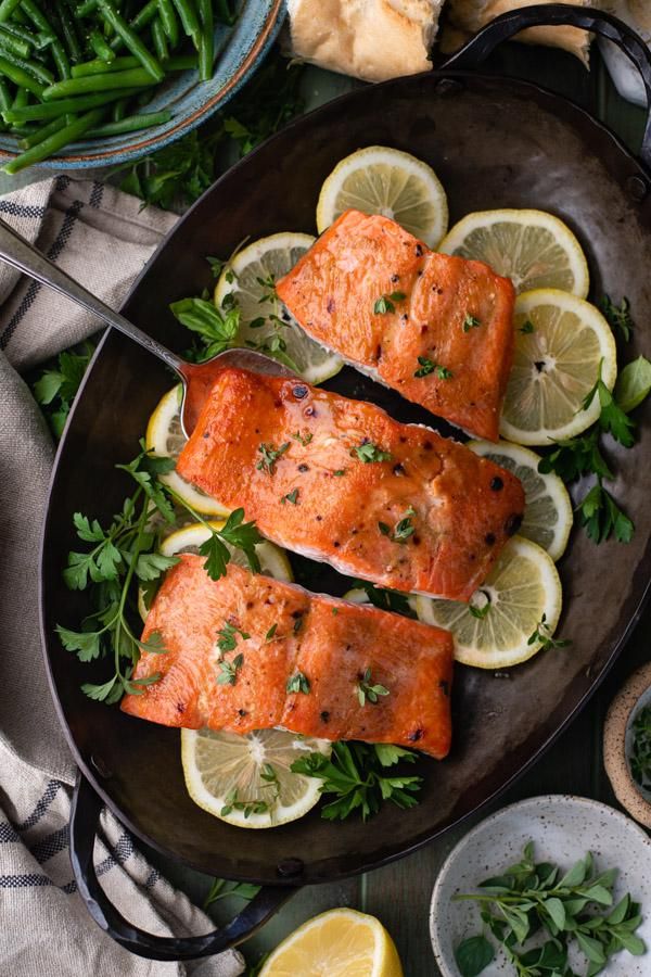 This 4-ingredient roasted salmon recipe will soon become a weeknight staple in your family's meal rotation! With a simple brown sugar Dijon mustard glaze, the fish develops a crisp exterior and a moist, buttery inside. Garnish each fillet with lemon wedges and fresh herbs for a restaurant-quality dinner in just 15 minutes!