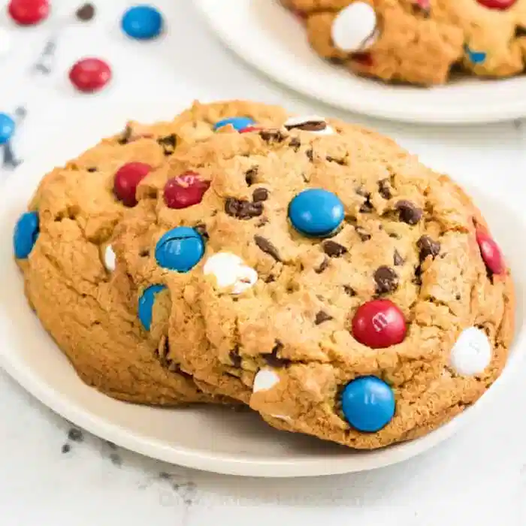 These fun 4th of July cookies are packed full of red white and blue M&Ms with plenty of chocolate and buttery deliciousness. The perfect cookie for summer parties. Serve these patriotic cookies as Fourth of July cookies, or for Memorial Day or Labor Day.