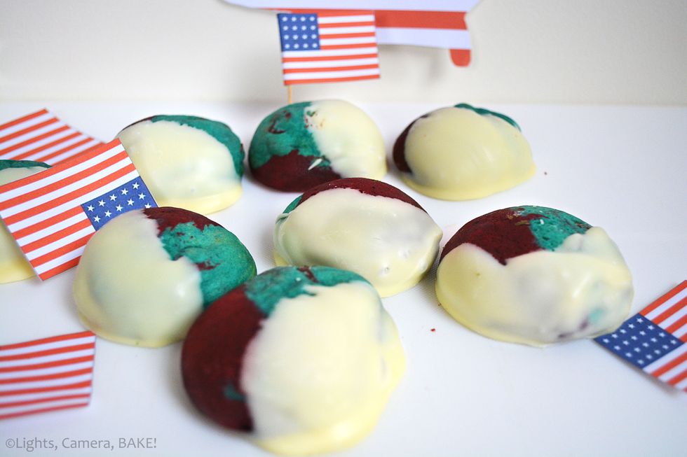 Soft and chewy cookies. One half is chocolate chip dyed blue and the other half are red velvet dyed red. Put them together, dunk them in white chocolate and you have the red, white and blue all in one.