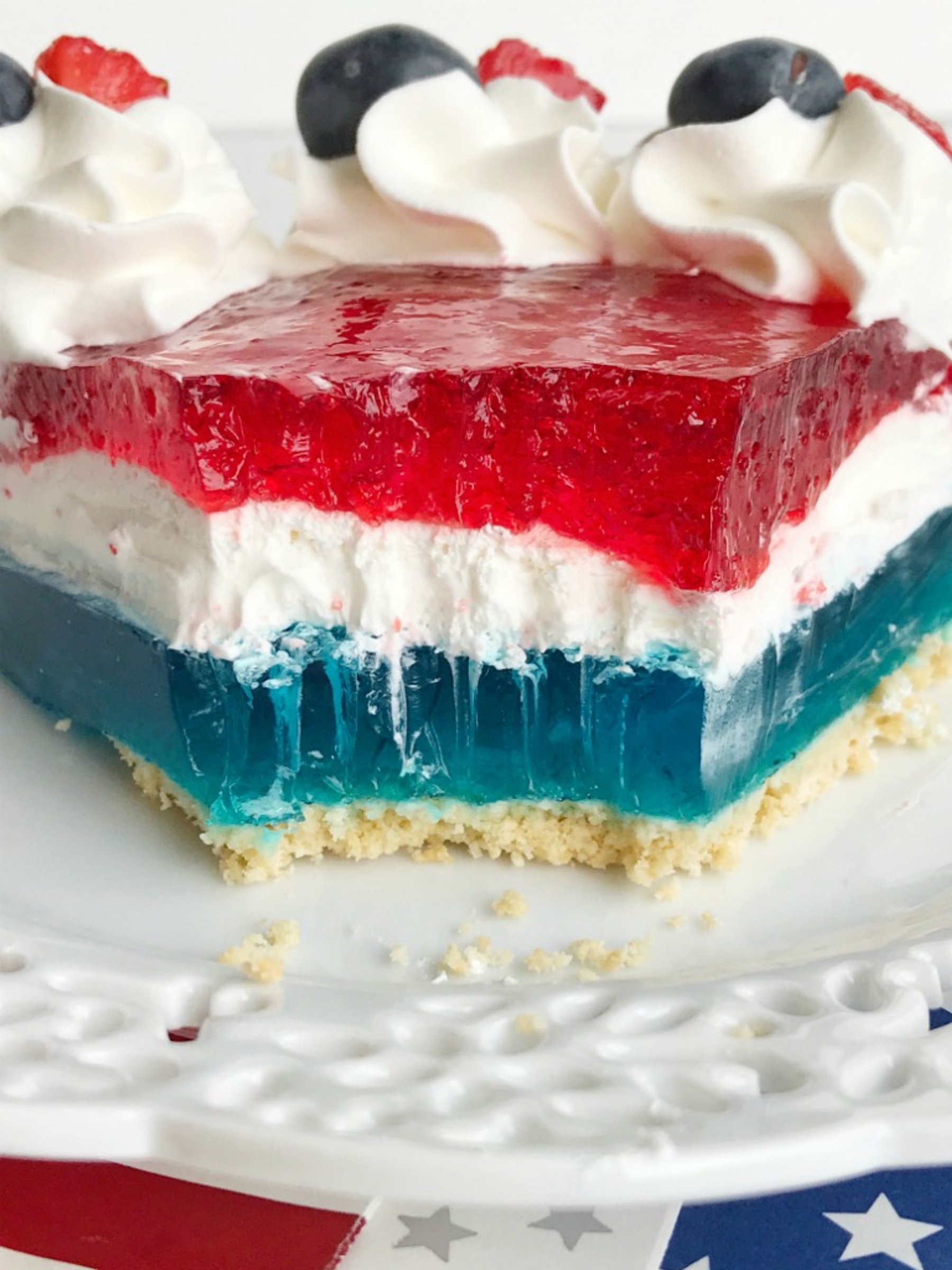 Celebrate the 4th of July with this delicious, totally festive, and easy patriotic Jello pie! 3 layers of red, white, and blue inside a store-bought prepared graham cracker crust. Top with additional Cool Whip and fresh fruit for a show stopper dessert at your own 4th of July picnic.