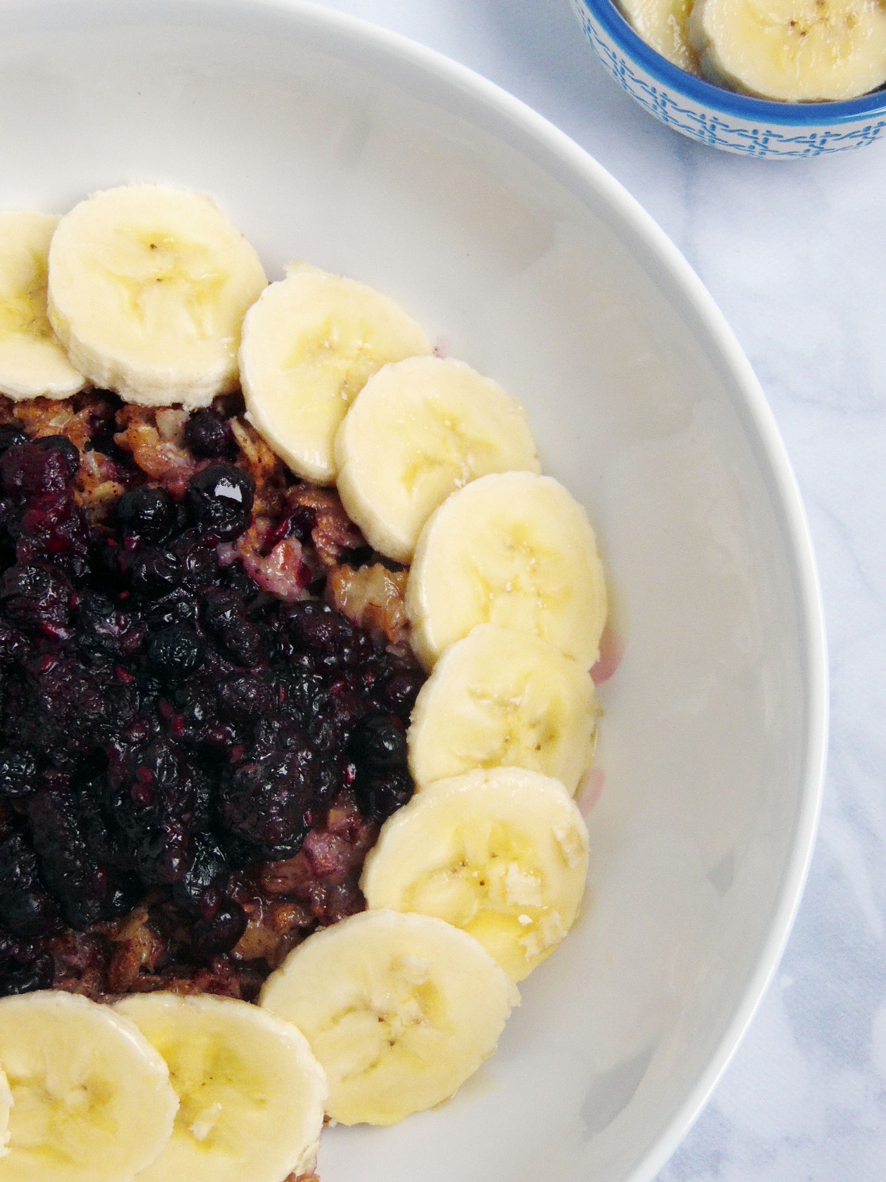 A hot (or cold) cereal topped with sweet mixed berries and sliced bananas. Can be made ahead of time and heated up as needed!
