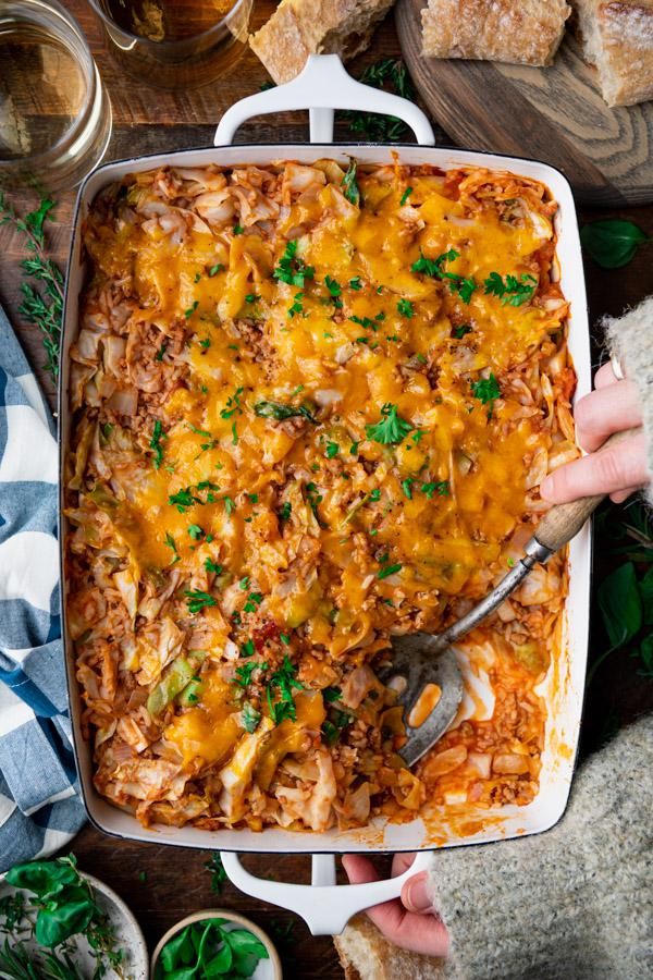 Total comfort food! This cabbage roll casserole is a nutritious dinner that's full of flavor. With ground beef, tomato soup, veggies, rice, bacon, and cheese, the dish includes all of the ingredients from my great grandmother's Polish stuffed cabbage rolls -- with none of the rolling and stuffing required! Pair the cozy unstuffed cabbage roll casserole with a side of cornbread, 3-ingredient buttermilk biscuits, or a basket of blueberry muffins.