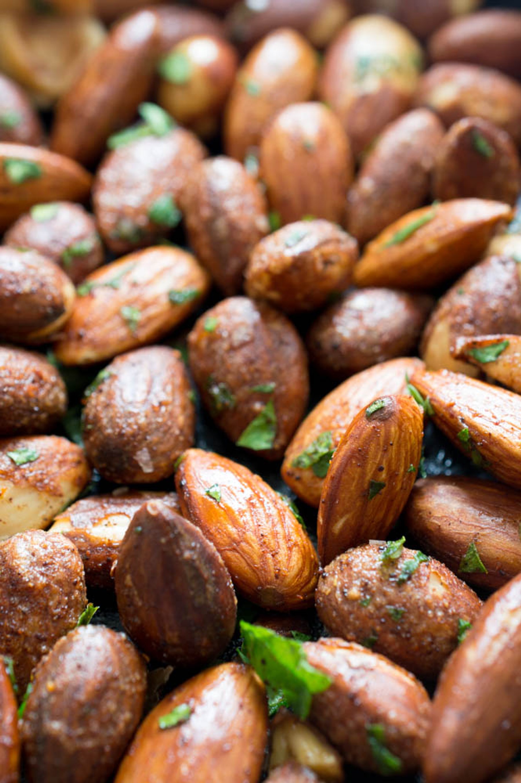 Pan Roasted 5 Minute Spicy Chili Almonds. A super easy to make snack! Tossed with fresh cilantro and spices.