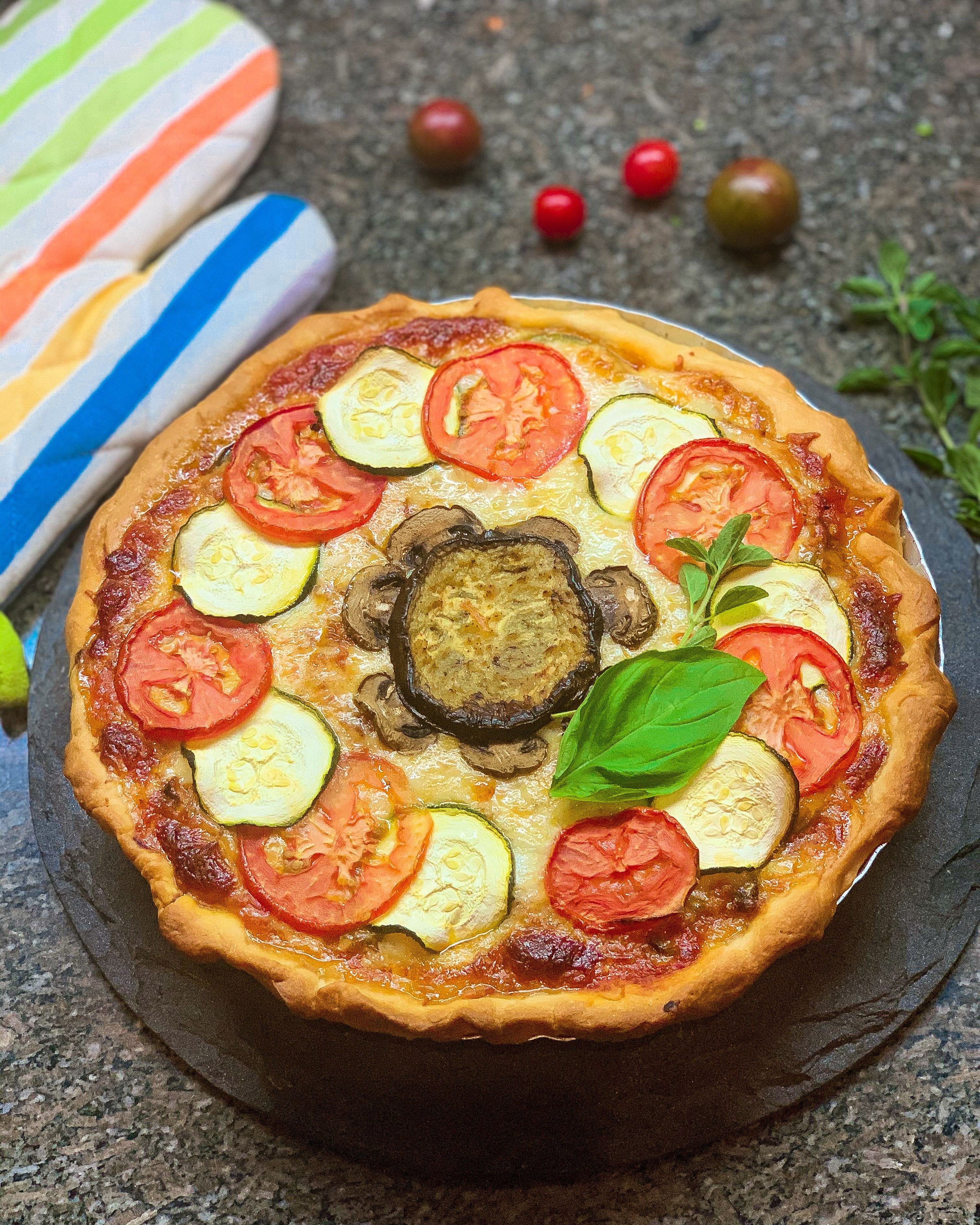 This pizza tart has a buttery, whole wheat crust loaded with the goodness of fresh vegetables and mozzarella cheese. It is a one-dish meal, and a recipe easy enough for a weekend dinner!