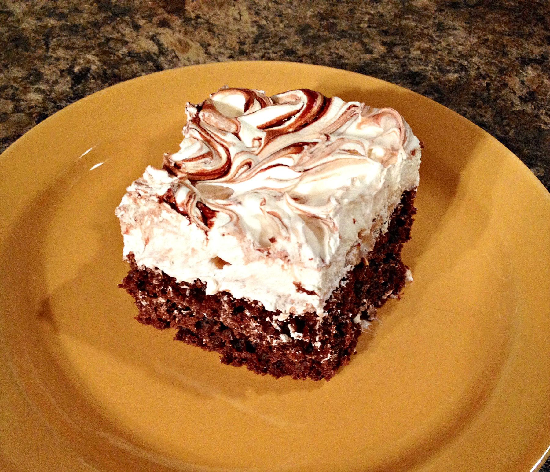 Last but not least, lightly drizzle the chocolate syrup over the cool whip and then take a butter knife and gently swirl the chocolate and cool whip together.