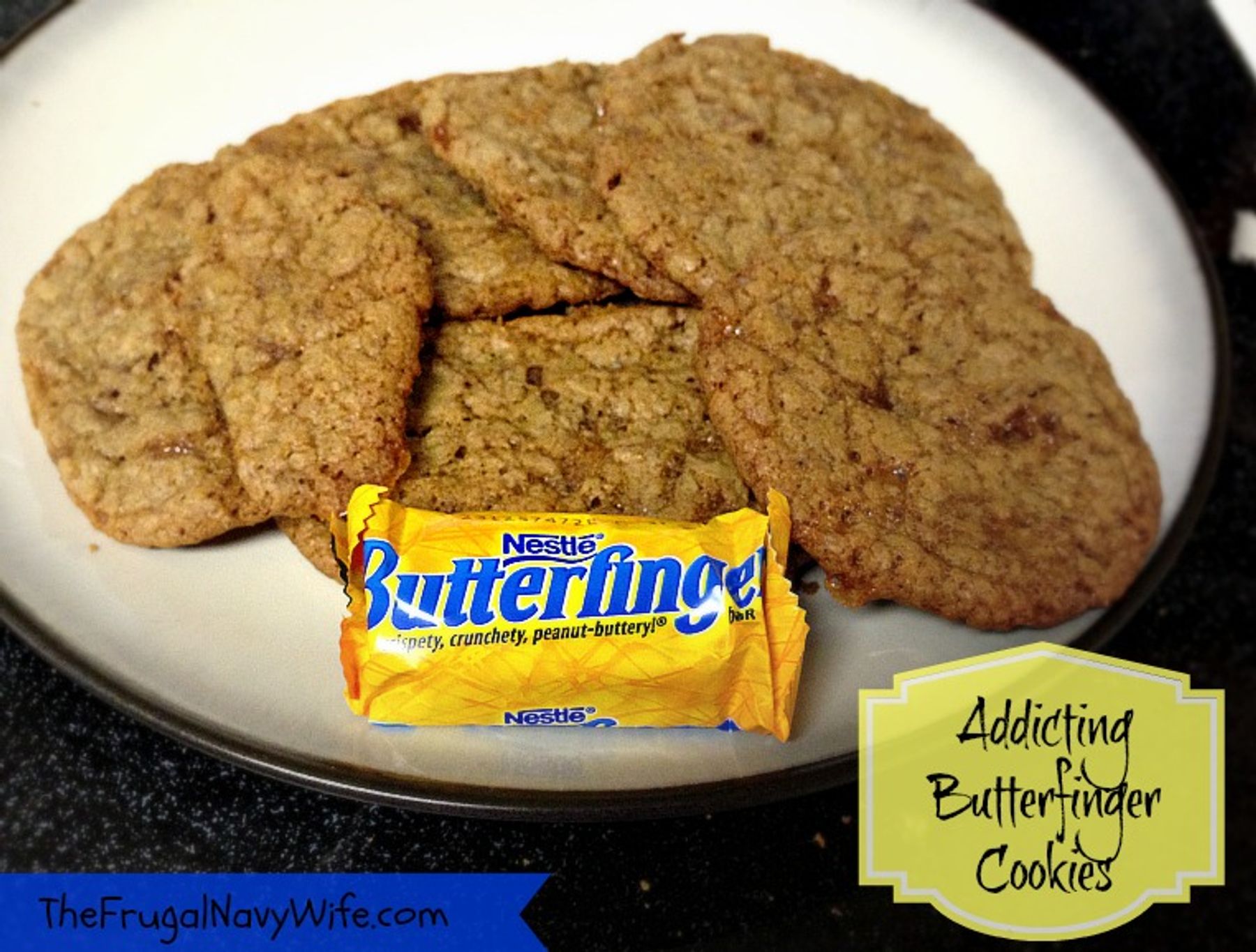 1. Using electric mixer, beat butter and both sugars in large bowl until well-blended. Add egg and vanilla and beat until fluffy. Beat in flour, salt and baking soda. Stir in butterfingers (dough will be...