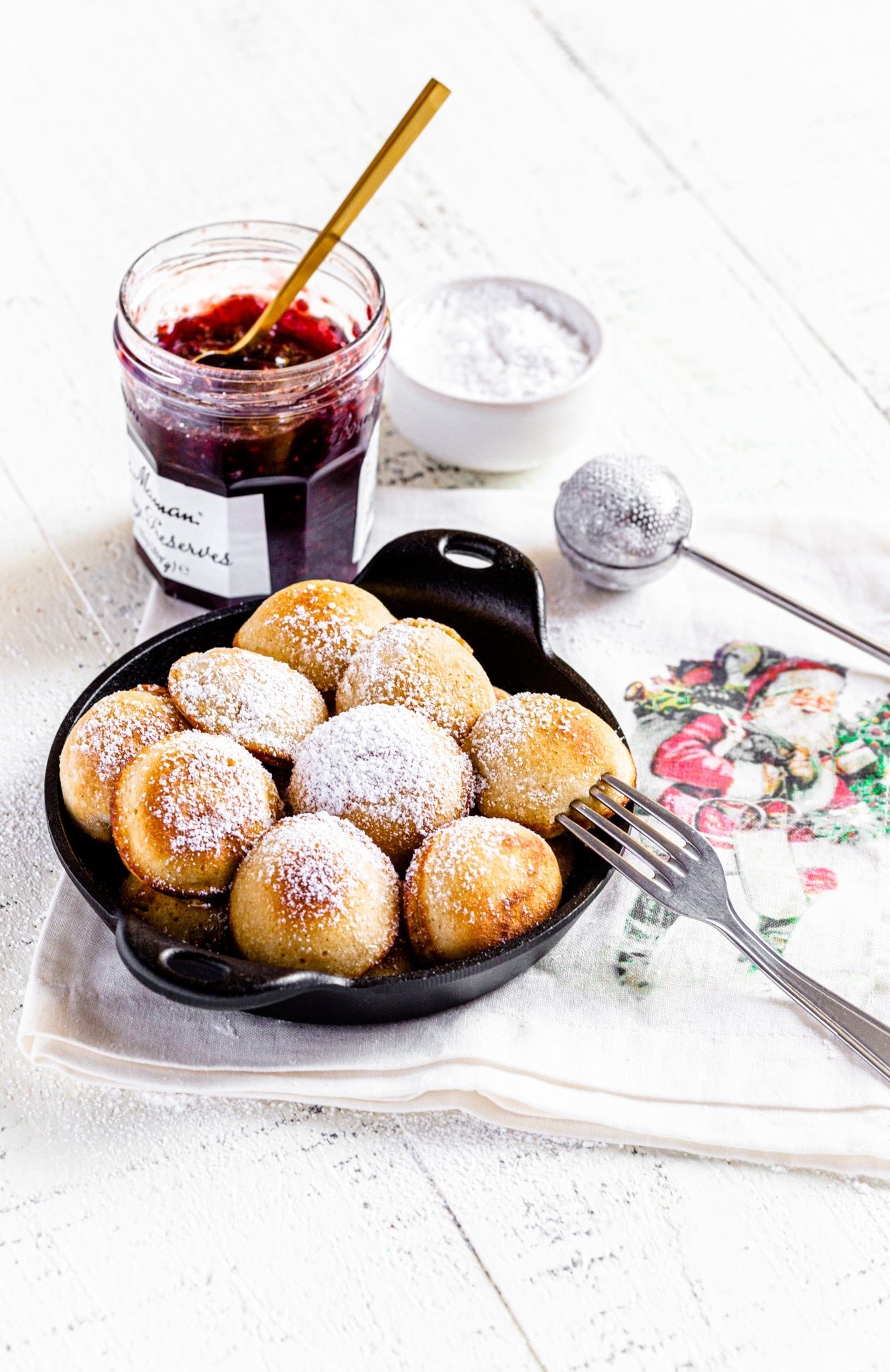 Make aebleskiver mini pancakes in 30 minutes! Brush with melted butter, and sprinkle with powdered sugar. Serve with jam or warm maple syrup!