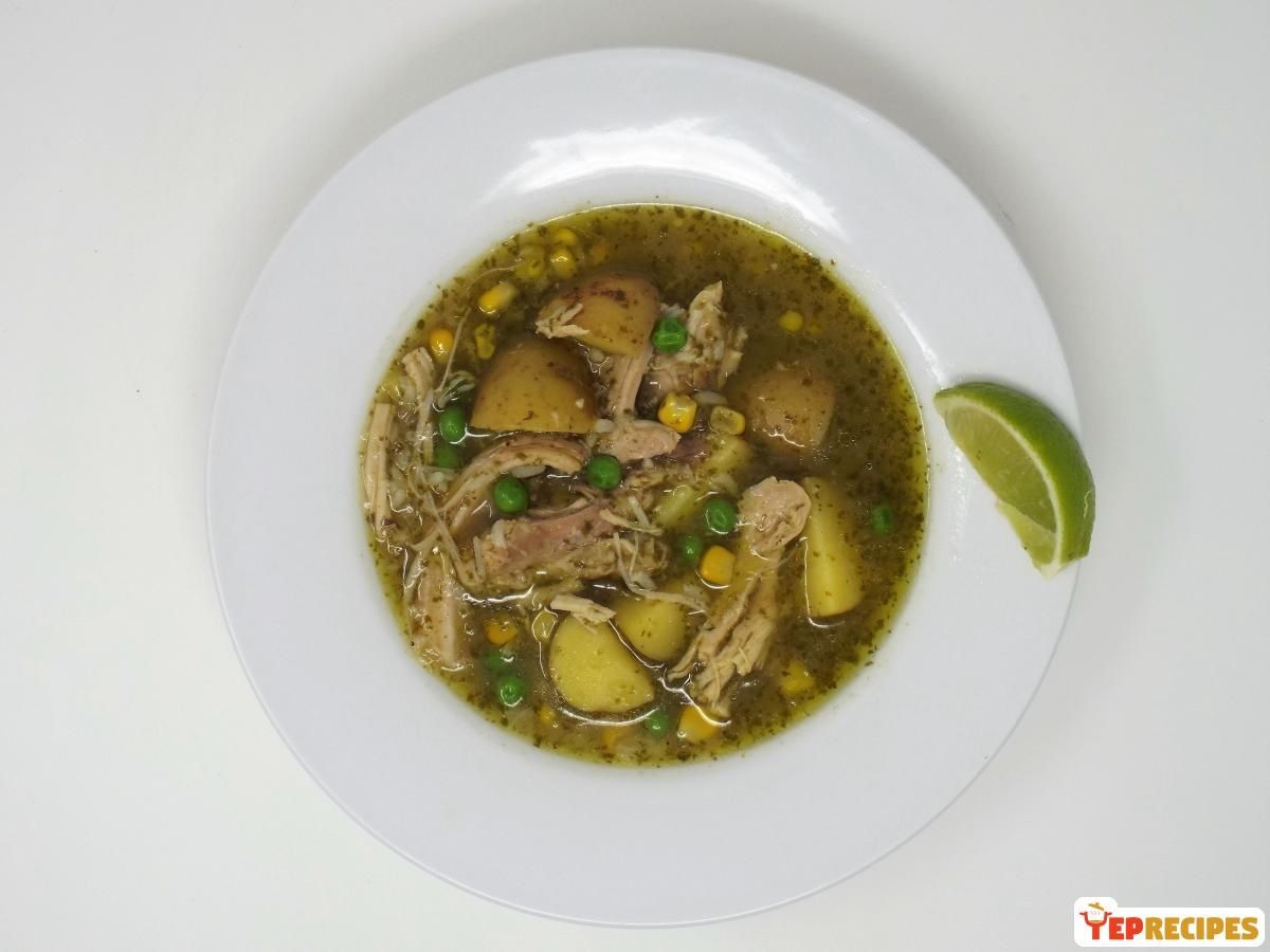 A Peruvian soup made up of chicken, vegetables, rice, and lots of fresh cilantro.