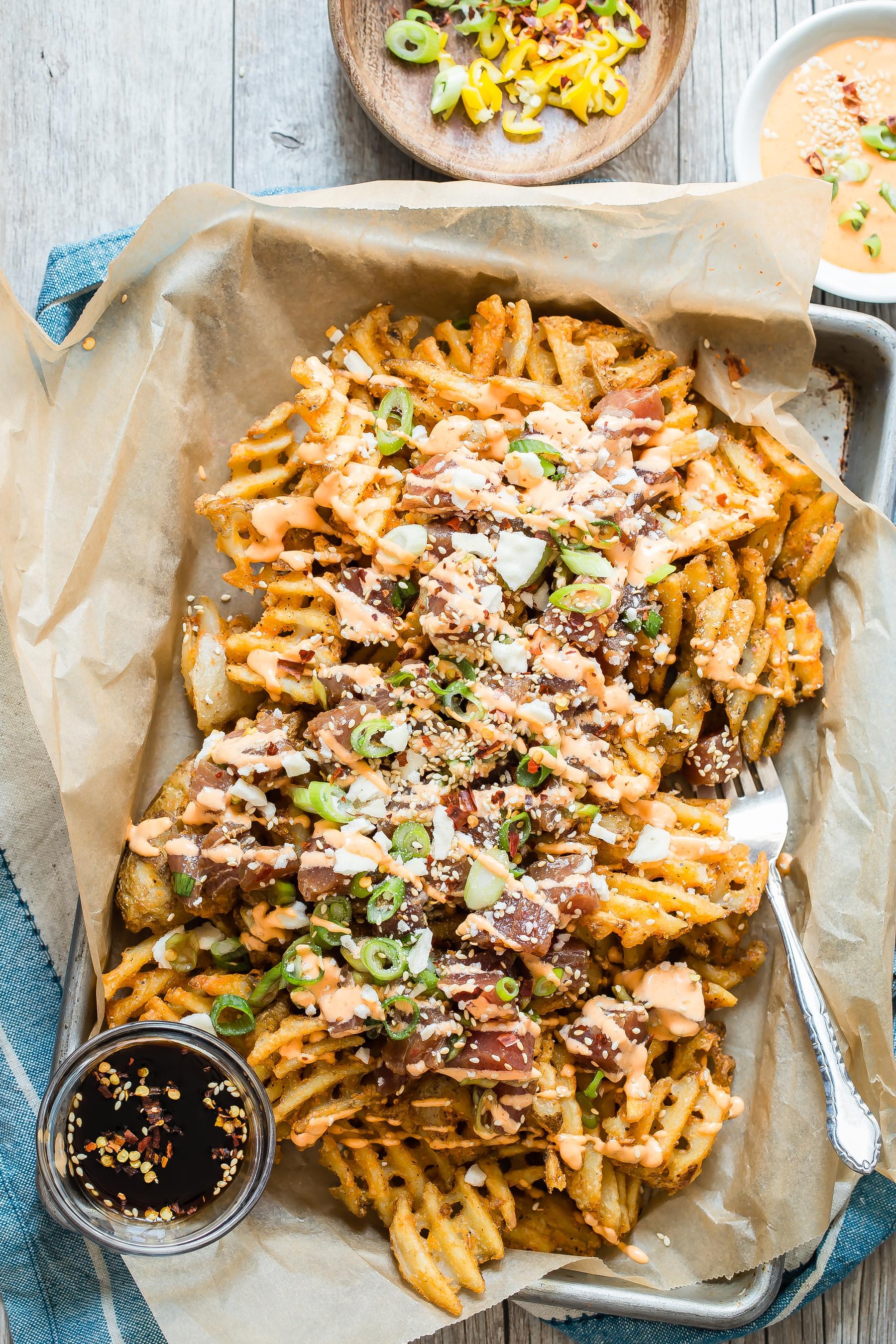 Crispy waffle fries covered in fresh ahi poke tuna and Sriracha drizzle.