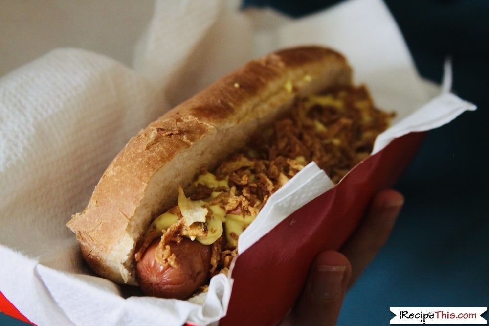 Air Fryer Hot Dogs served in warm hot dog buns and loaded with mustard and crispy fried onions. I love cooking hot dogs in the air fryer for a quick snack, lunch or dinner.
