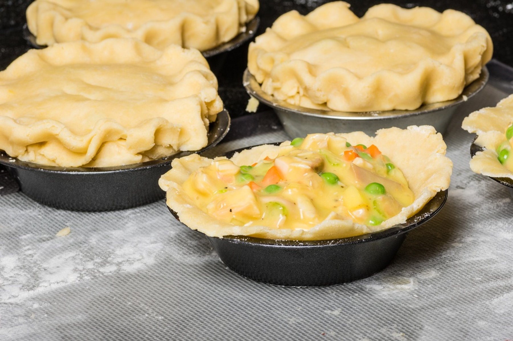 1. Make your shortcrust pastry and fill the bottom of your ramekins with it. Saving some pastry for the tops of the pies.