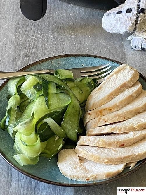 | Cucumber Noodles. A delicious way to enjoy air fryer Thai chicken breasts on a bed of cucumber noodles. Loaded with Thai flavours, easy to recreate at home and perfect for a healthy light lunch. A fun alternative to the traditional air fryer chicken breasts. |
