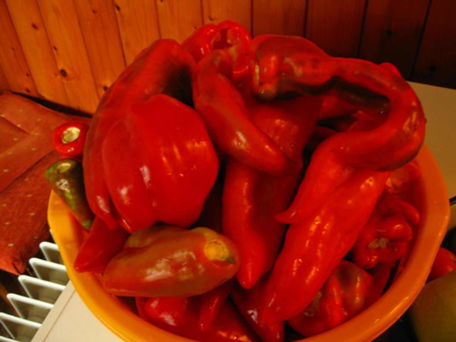 1.wash your red pepper and put the eggplant and on top of it just as many pepper as to cover it. heat your oven to 220 degree Celsius and at least leave it in for 20 min.