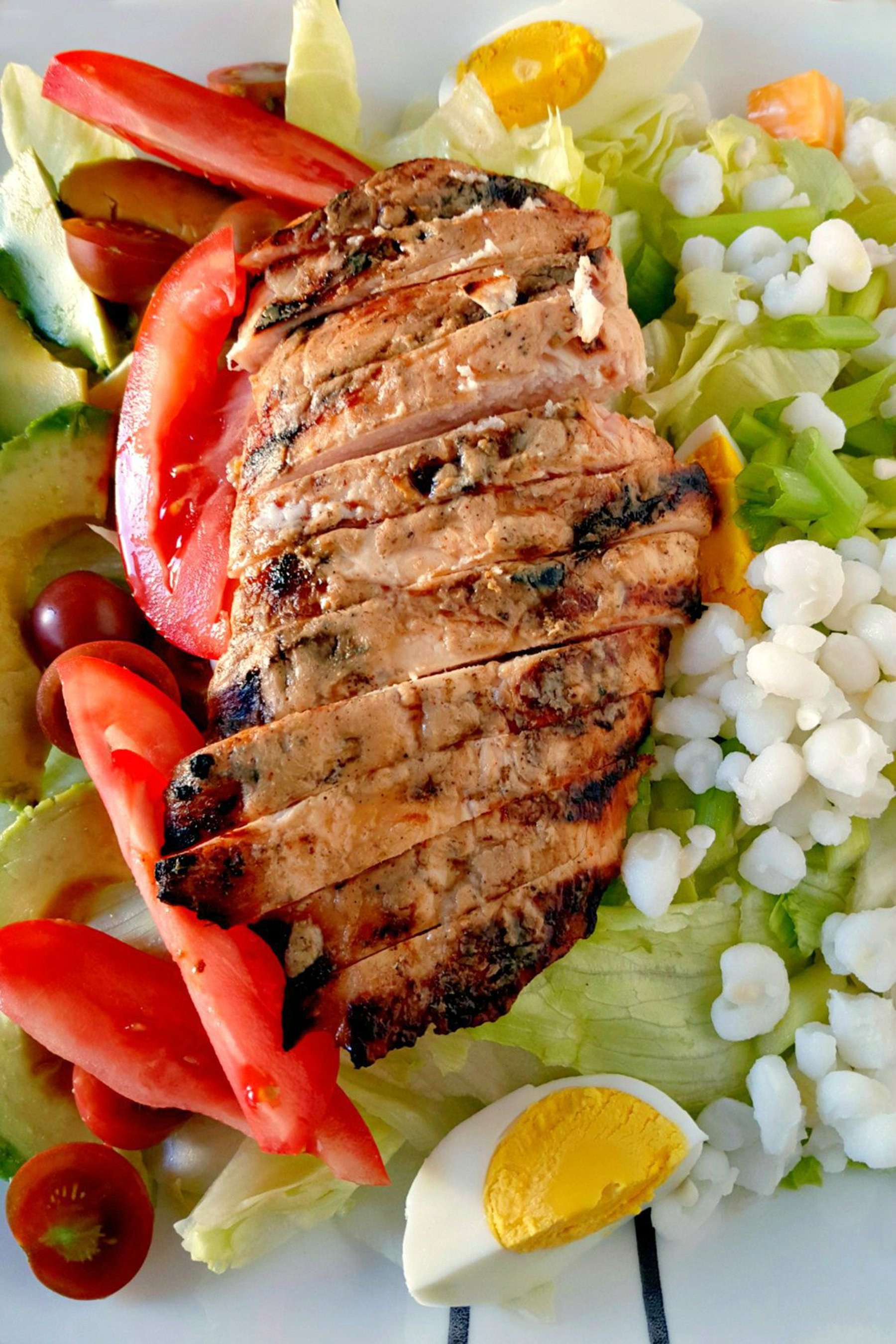 Chicken breasts are basted in this white barbecue sauce and grilled before slicing and topping this Alabama Cobb Salad. Don’t let this white barbecue sauce fool you! It’s got a kick!