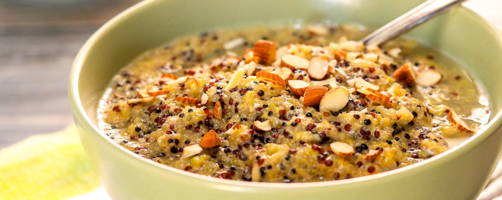 In our recipe, we have modified the traditional dish by using quinoa instead of the traditionally used cereals. Quinoa has gained notoriety in recent times as a 'trending' food but there's good reason for this as it provides highly-digestible protein, having an excellent amino acid profile. Additionally it is gluten-free thus offering a good dietary choice for celiacs. Bananas contain a lot of vitamin C and folic acid. Additionally they are rich in potassium which is beneficial for heart muscle contractions. The nutty-flavoured almond milk may serve as an efficacious substitute for intolerances to cow milk, containing a lot of monounsaturated fat, magnesium, copper, bioactive phytochemicals and is cholesterol-free. It is a remarkable dietary option assisting with obesity, inflammation, cardiovascular and diabetes risks.
