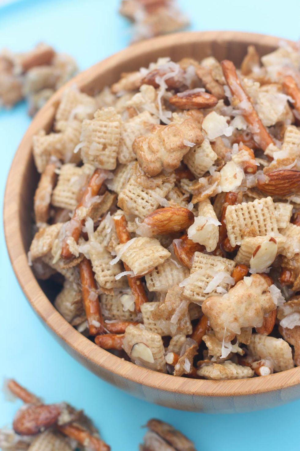 Almond Coconut Chex Mix includes my favorite cereals, pretzels, and golden grahams tossed in a sweet syrup to make the most addicting snack mix!