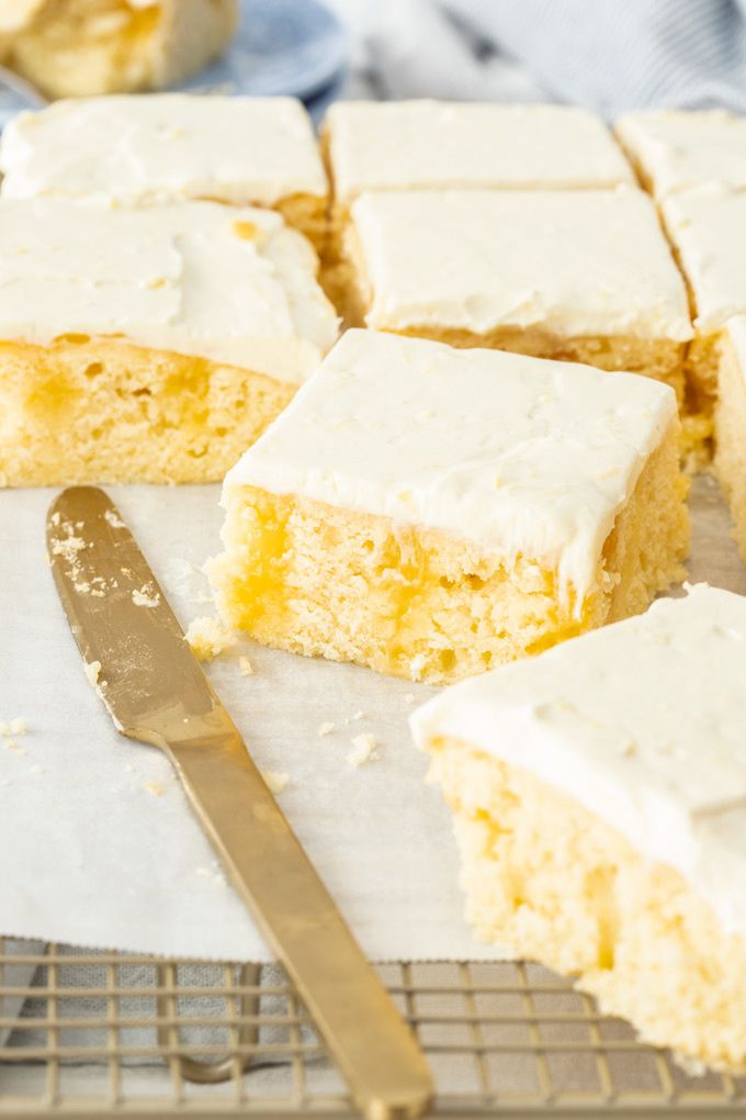 This Almond Lemon Poke Cake, filled with lemon curd and topped with an easy ricotta cream topping, is incredibly easy to make. Made in a sheet pan so it's easy to slice and serve too.