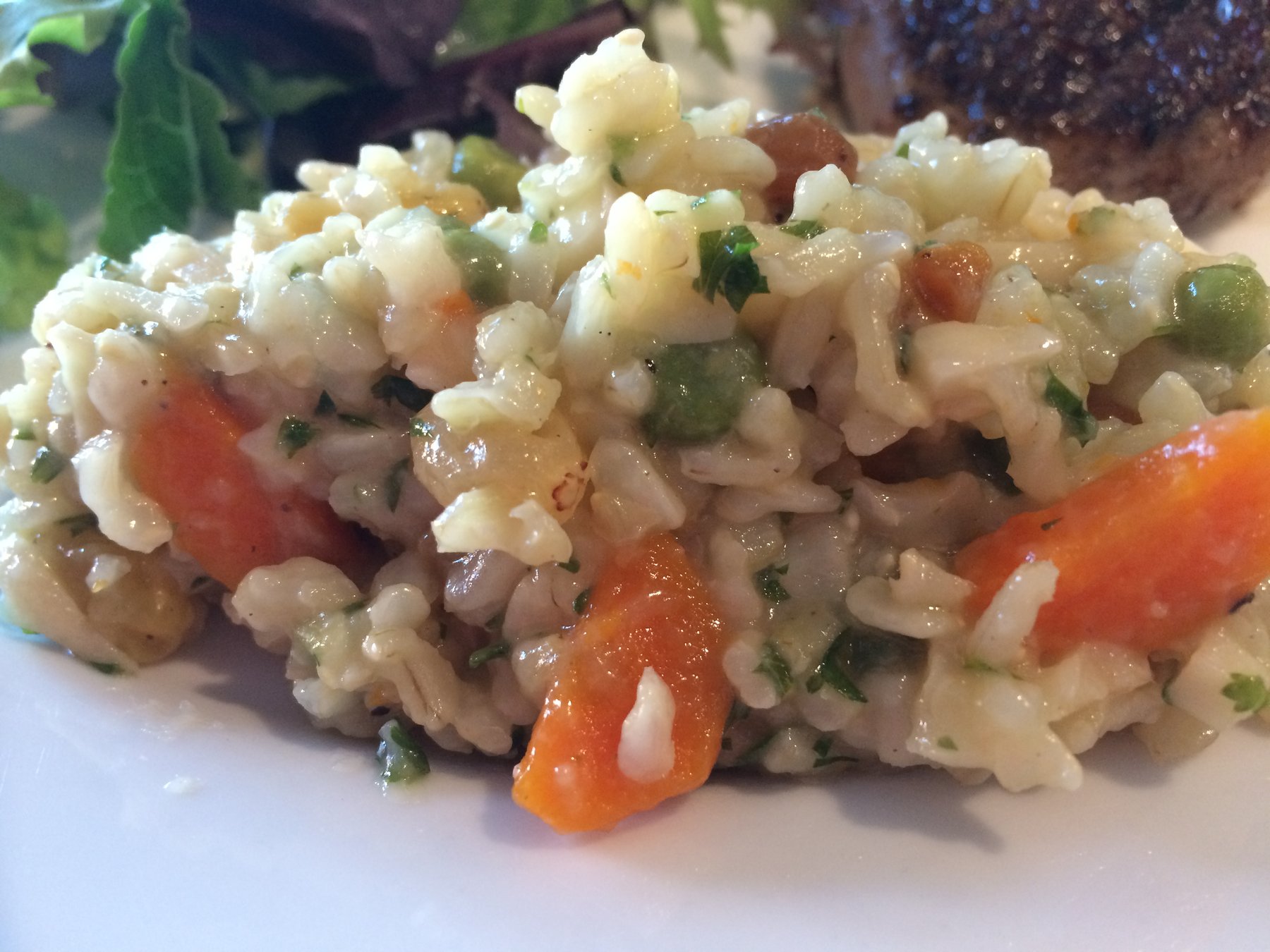 Melt the butter in a pot over medium heat. Add the onions, carrots, almonds, salt and pepper and saute until onions are translucent. Add the rice and chicken broth and bring to a boil. Cover and cook according to rice package directions until almost all the water is absorbed. Add the raisins and peas and allow the rice to finish cooking. Stir in the parsley before serving.