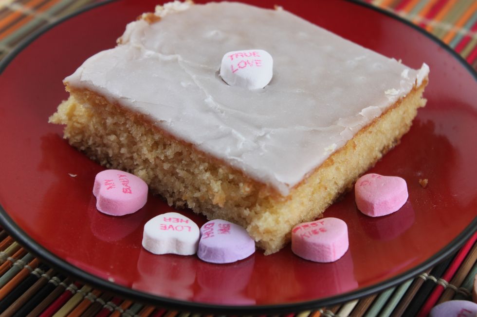 I love sheet cake! My favorite is Texas sheet cake, but I thought I’d like to try a white one as well, so when I stumbled upon this recipe on Pinterest, I knew it was right up my alley! And it was–right up my alley that is. I love that the cake is so thin, but moist and the frosting –just barely there. This could be “dressed up” for any number of holidays or celebrations and would make for a great young child do-it-yourself decorated Birthday cake..