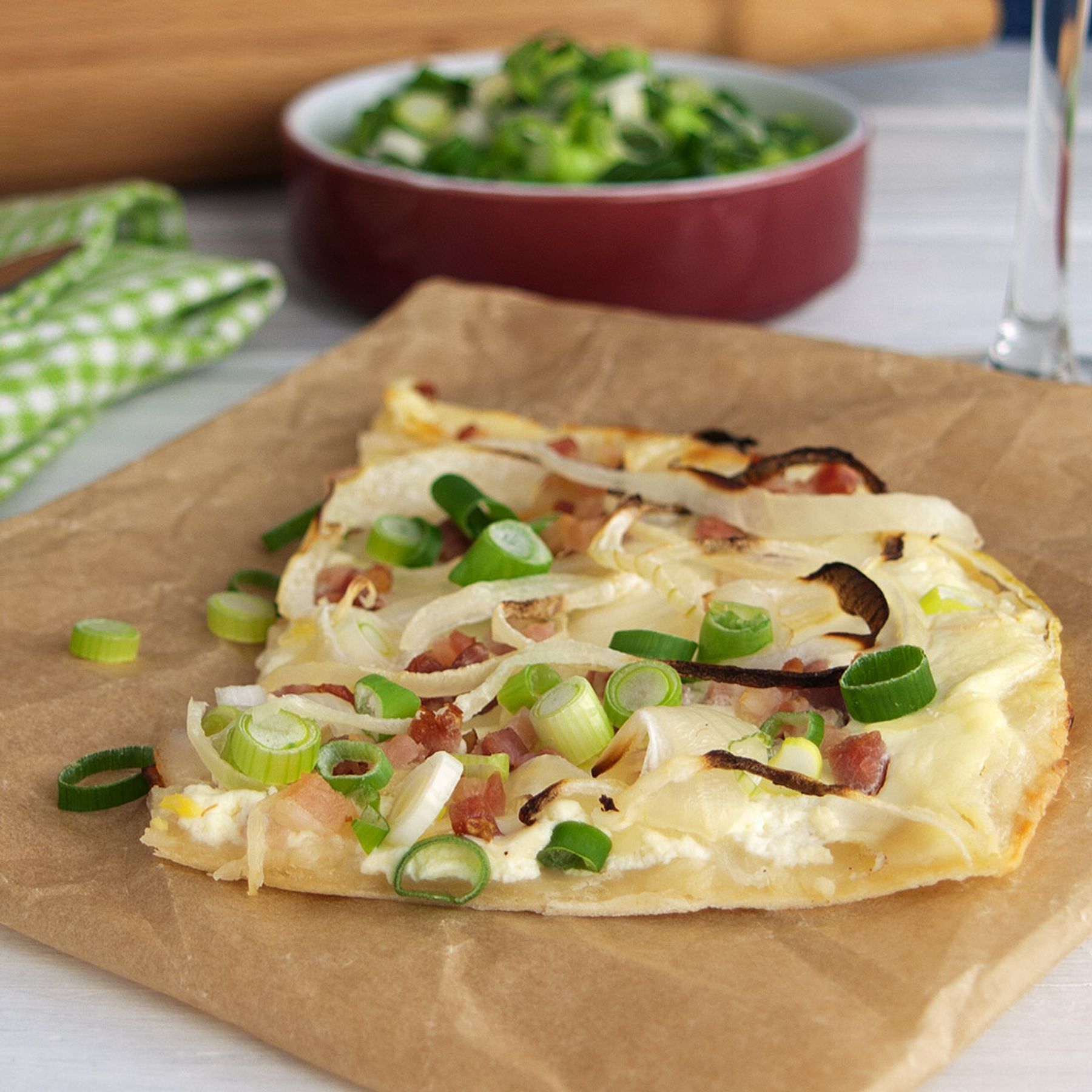 Traditional Alsatian tarte flambée recipe with very easy and very fast to-make dough, cream fraiche, bacon and onions. Ready to serve in less 1 hour.