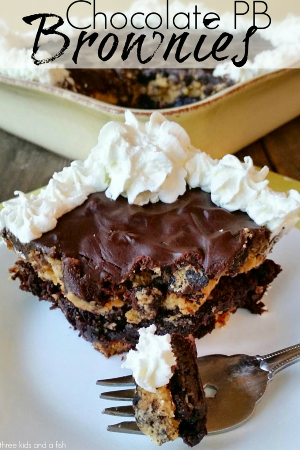 There is layers of amazingness here with a Reese's peanut butter cup brownie bottom, a peanut butter cream cheese topped with crushed peanut butter oreos middle, and topped with a velvety chocolate ganache! The whipped cream is the sweet finishing touch to make this chocolate peanut butter brownie impossible to resist!