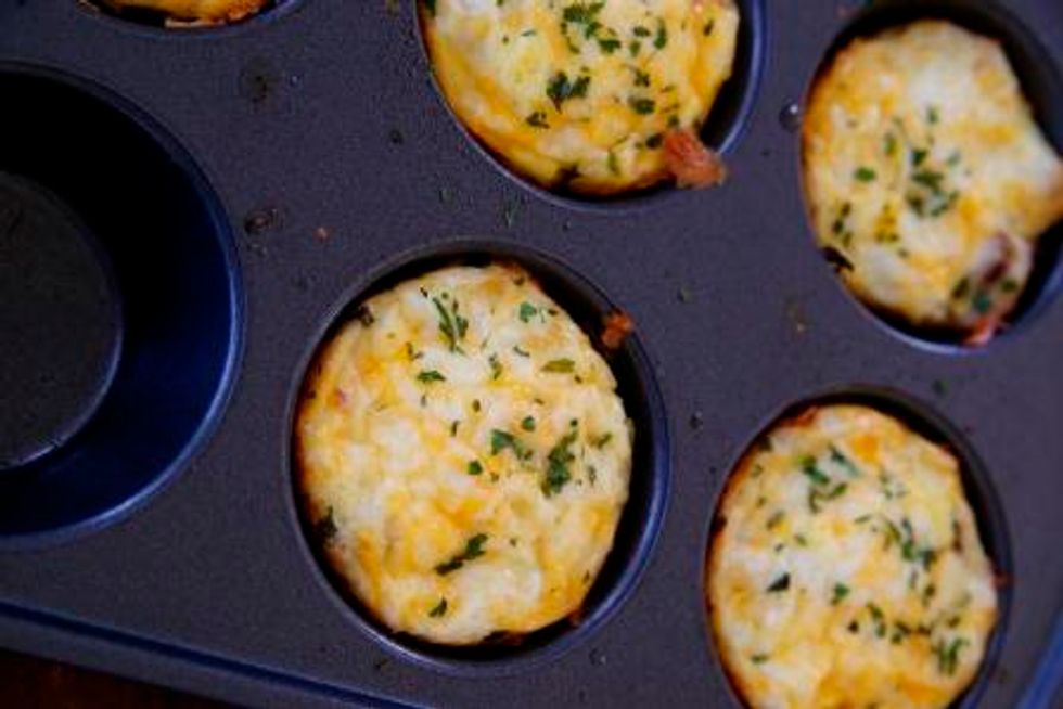Eggs, hash browns, sausage, and cheese breakfast baked in a muffin tin.