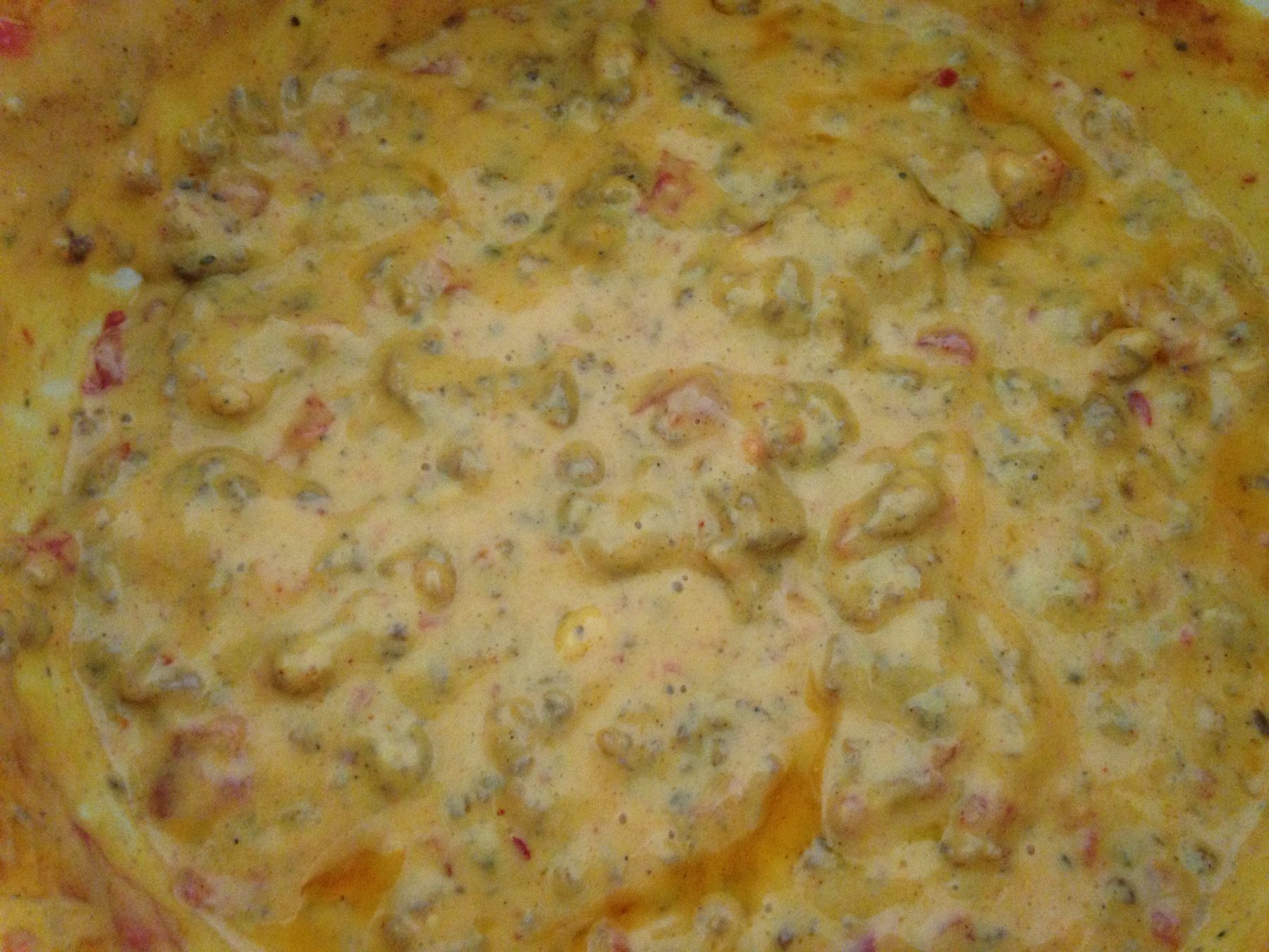 3) Cut Velveeta into large cubes and add to the sausage and vegetables. Top with the chopped tomatoes, jalapenos, etc... Cook over LOW heat until the cheese has melted and ingredients are well combined (stir occasionally). Enjoy with tortilla or corn chips!