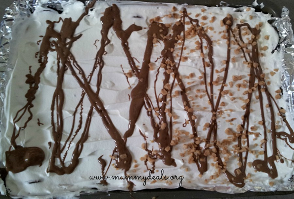 Next a tub of cool whip spread out over the sandwiches.