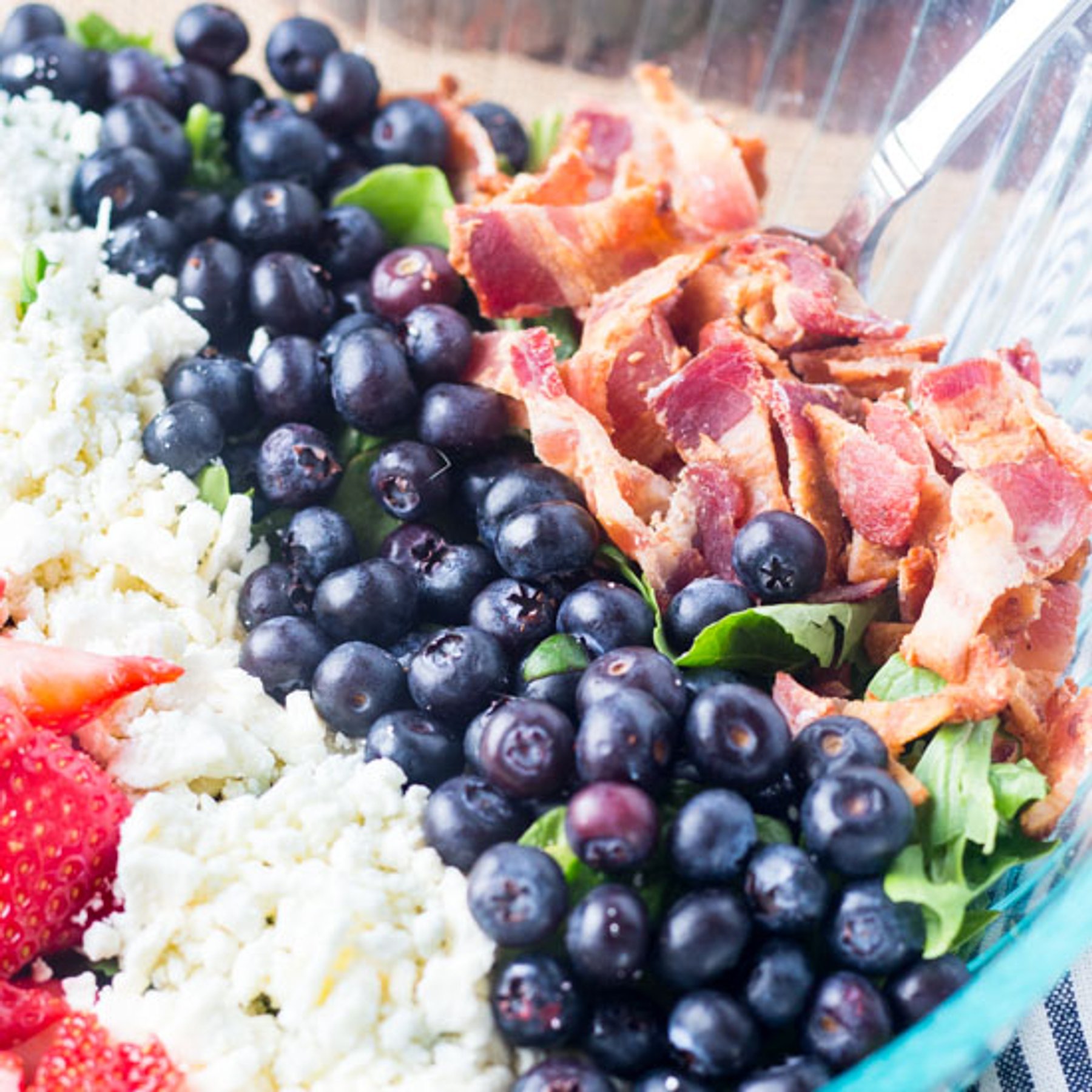1. To make salad layer greens with rows of strawberries, blueberries, feta, and bacon.