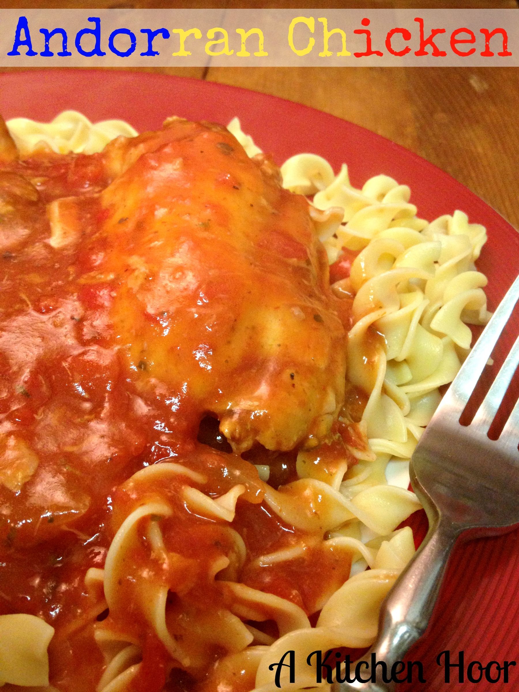 Chicken is slow braised in a tomato and wine broth typical of Andorran Cunillo.