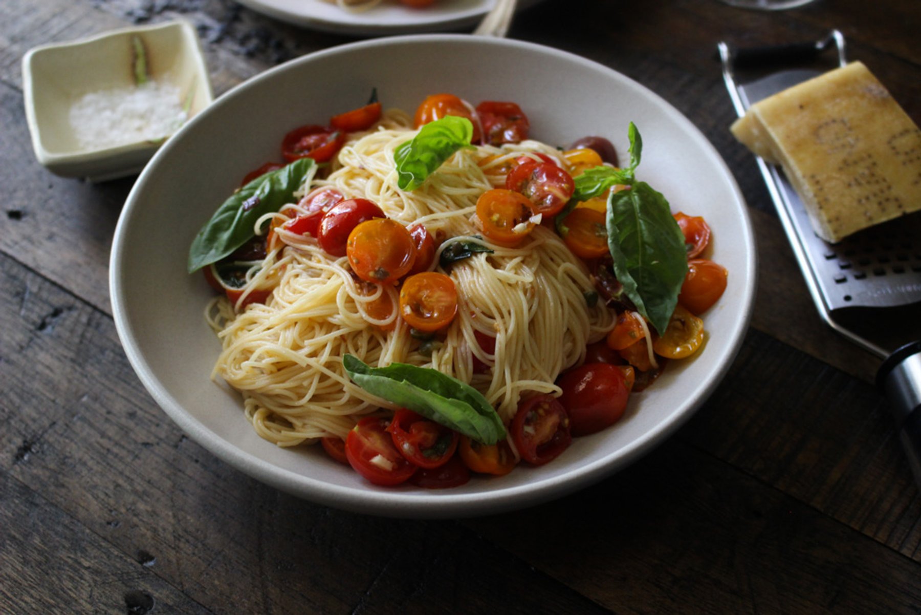 Make the raw tomato sauce 30 minutes before you cook the pasta so that the flavors have time to come together. In a large bowl mix the tomatoes, olive oil, capers, basil, garlic, and season aggressively...