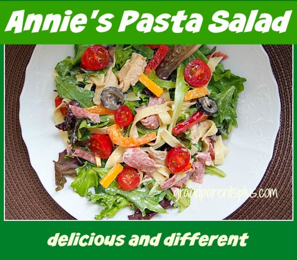 A no-mayo ,hearty pasta salad that is served on a bed of greens. This is a main dish salad! Two kinds of meat, both chicken and salami, plus loads of veggies along with fettuccine marinated in a Caesar dressing, make this a satisfying meal!